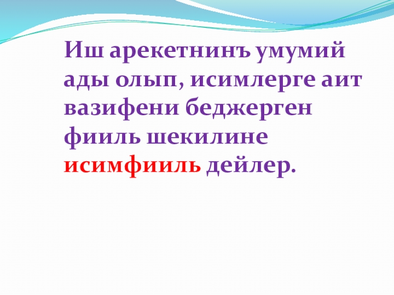 Слайд 6Иш арекетнинъ умумий ады олып, исимлерге аит вазифени беджерген фииль шекилине