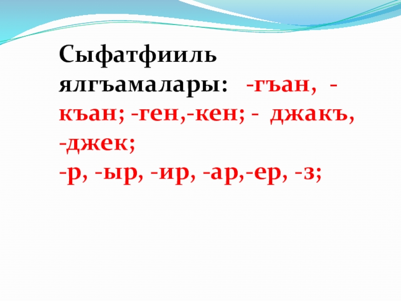 Слайд 10Сыфатфииль ялгъамалары: -гъан, -къан; -ген,-кен; - джакъ, -джек;