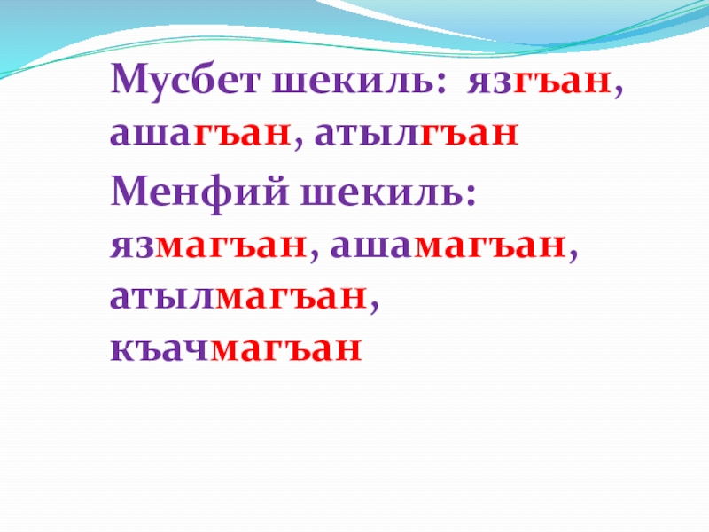 Мусбет шекиль: язгъан, ашагъан, атылгъан Менфий шекиль: язмагъан, ашамагъан, атылмагъан, къачмагъан
