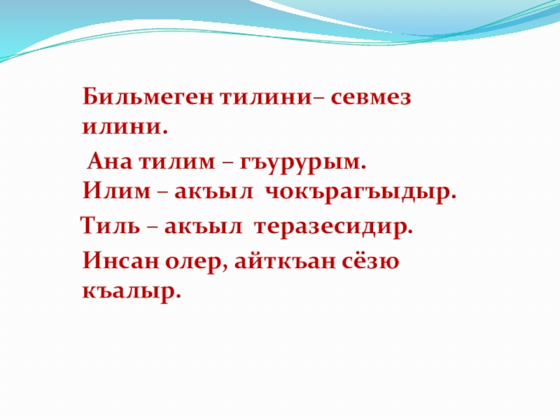 Бильмеген тилини– севмез илини.  Ана тилим – гъурурым.       Илим –