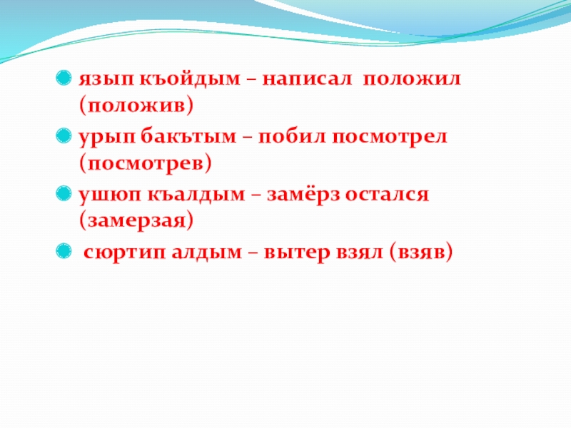 язып къойдым – написал положил (положив)урып бакътым – побил посмотрел (посмотрев)ушюп къалдым – замёрз остался (замерзая) сюртип