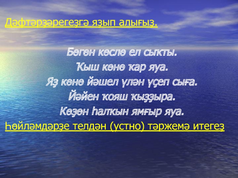 Дәфтәрҙәрегеҙгә яҙып алығыҙ.Бөгөн көслө ел сыҡты.Ҡыш көнө ҡар яуа.Яҙ көнө йәшел үлән үҫеп сыға.Йәйен ҡояш ҡыҙҙыра.Көҙөн һалҡын