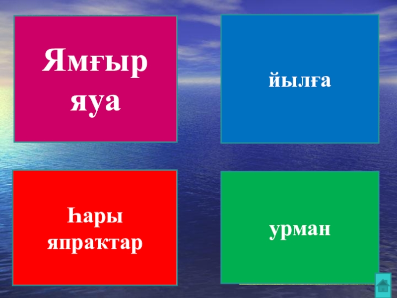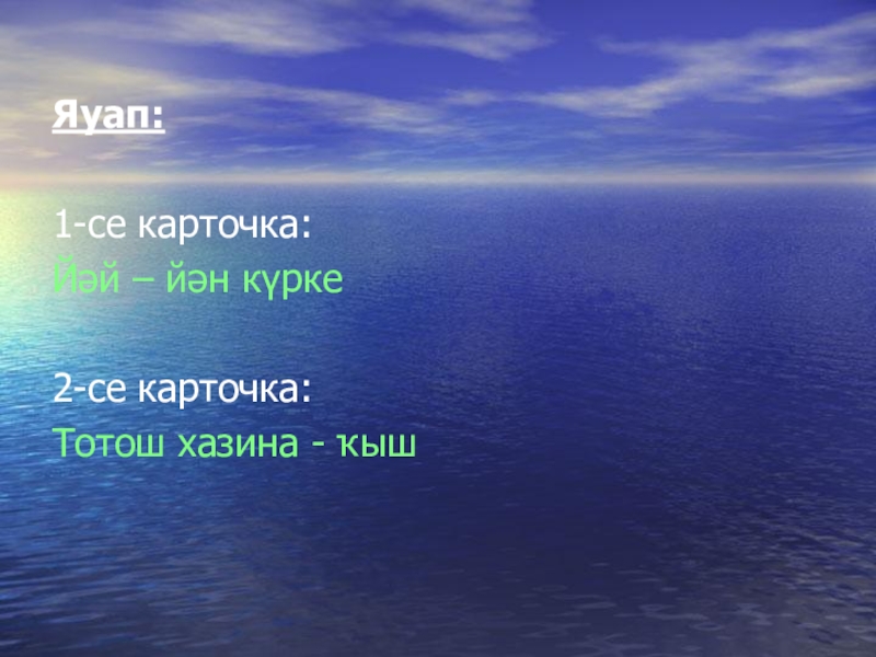 Яуап:1-се карточка:Йәй – йән күрке2-се карточка:Тотош хазина - ҡыш