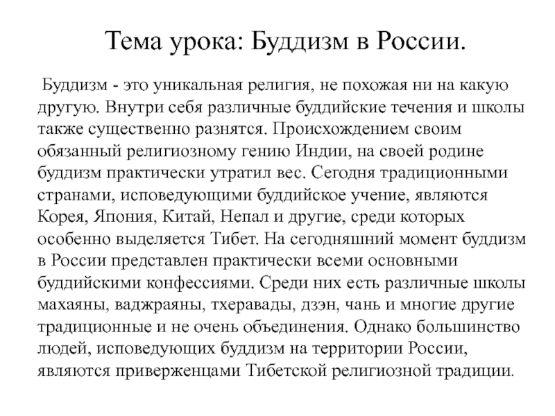похожая ни на какую другую. Внутри себя различные буддийские течения и школы также существенно разнятся. Происхождением своим обязанный религиозному гению Индии, на своей родине буддизм практически утратил вес. Сегодня традиционными странами, исповедующими буддийское учение, являются Корея, Япония, Китай, Непал и другие, среди которых особенно выделяется Тибет. На сегодняшний момент буддизм в России представлен практически всеми основными буддийскими конфессиями. Среди них есть различные школы махаяны, ваджраяны, тхеравады, дзэн, чань и многие другие традиционные и не очень объединения. Однако большинство людей, исповедующих буддизм на территории России, являются приверженцами Тибетской религиозной традиции.