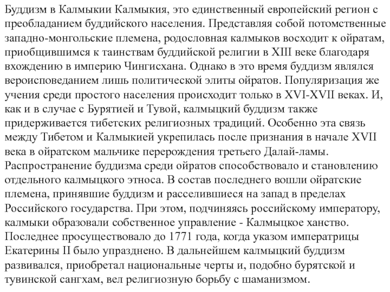 населения. Представляя собой потомственные западно-монгольские племена, родословная калмыков восходит к ойратам, приобщившимся к таинствам буддийской религии в XIII веке благодаря вхождению в империю Чингисхана. Однако в это время буддизм являлся вероисповеданием лишь политической элиты ойратов. Популяризация же учения среди простого населения происходит только в XVI-XVII веках. И, как и в случае с Бурятией и Тувой, калмыцкий буддизм также придерживается тибетских религиозных традиций. Особенно эта связь между Тибетом и Калмыкией укрепилась после признания в начале XVII века в ойратском мальчике перерождения третьего Далай-ламы. Распространение буддизма среди ойратов способствовало и становлению отдельного калмыцкого этноса. В состав последнего вошли ойратские племена, принявшие буддизм и расселившиеся на запад в пределах Российского государства. При этом, подчиняясь российскому императору, калмыки образовали собственное управление - Калмыцкое ханство. Последнее просуществовало до 1771 года, когда указом императрицы Екатерины II было упразднено. В дальнейшем калмыцкий буддизм развивался, приобретал национальные черты и, подобно бурятской и тувинской сангхам, вел религиозную борьбу с шаманизмом.