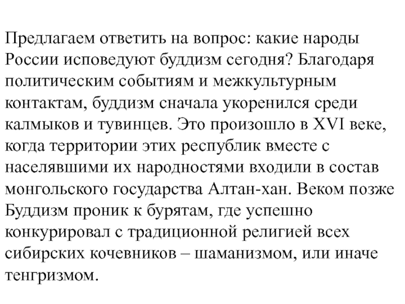 политическим событиям и межкультурным контактам, буддизм сначала укоренился среди калмыков и тувинцев. Это произошло в XVI веке, когда территории этих республик вместе с населявшими их народностями входили в состав монгольского государства Алтан-хан. Веком позже Буддизм проник к бурятам, где успешно конкурировал с традиционной религией всех сибирских кочевников – шаманизмом, или иначе тенгризмом.