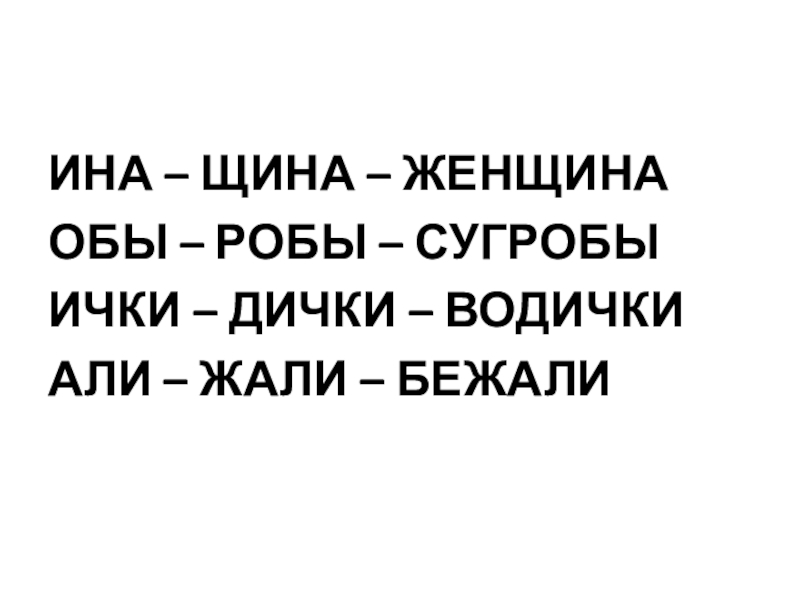 ИНА – ЩИНА – ЖЕНЩИНА ОБЫ – РОБЫ – СУГРОБЫ ИЧКИ – ДИЧКИ – ВОДИЧКИ АЛИ – ЖАЛИ – БЕЖАЛИ