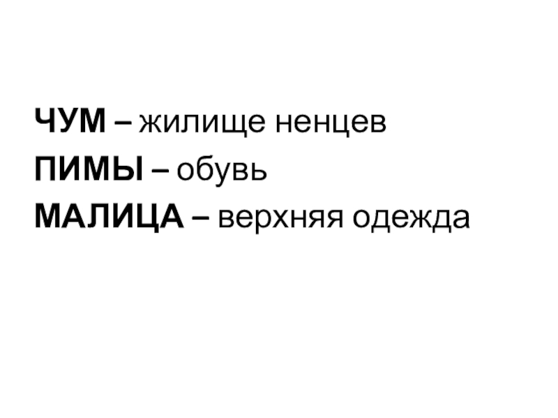 ЧУМ – жилище ненцевПИМЫ – обувь МАЛИЦА – верхняя одежда