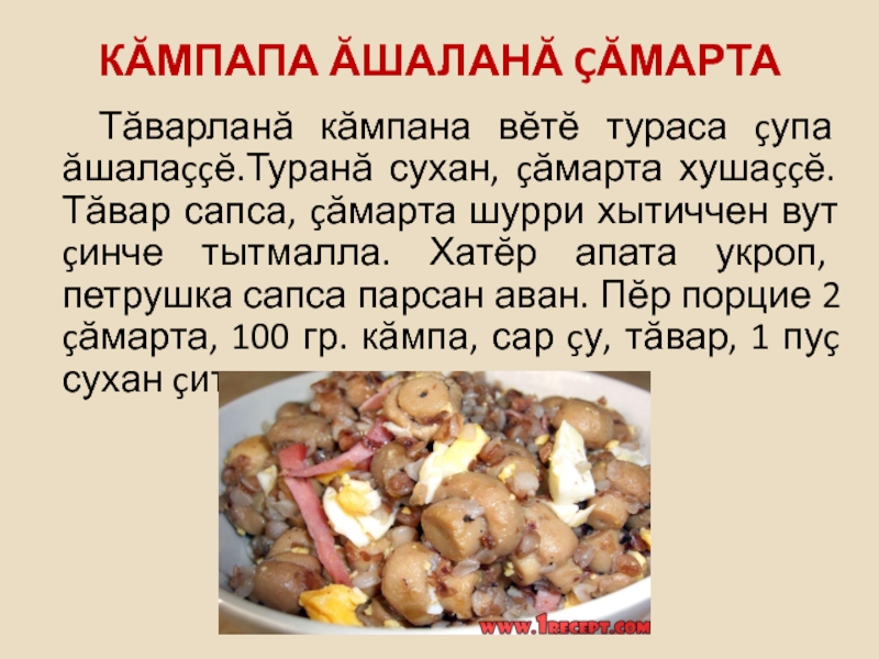сухан, çăмарта хушаççĕ. Тăвар сапса, çăмарта шурри хытиччен вут çинче тытмалла. Хатĕр апата укроп, петрушка сапса парсан аван. Пĕр порцие 2 çăмарта, 100 гр. кăмпа, сар çу, тăвар, 1 пуç сухан çитет.
