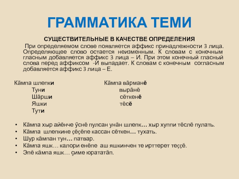 аффикс принадлежности 3 лица. Определяющее слово остается неизменным. К словам с конечным гласным добавляется аффикс 3 лица – И. При этом конечный гласный слова перед аффиксом -И выпадает. К словам с конечным согласным добавляется аффикс 3 лица – Е.
