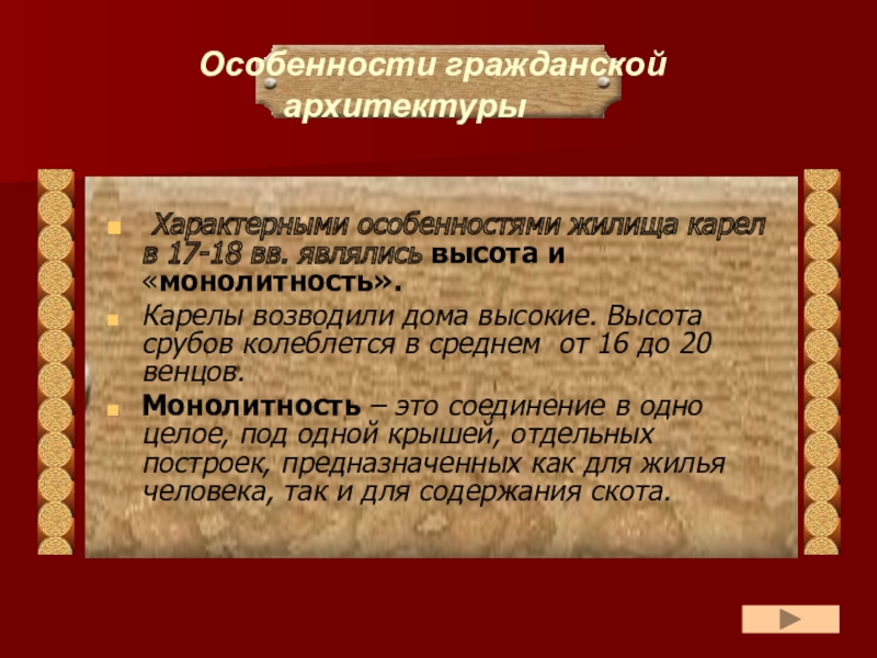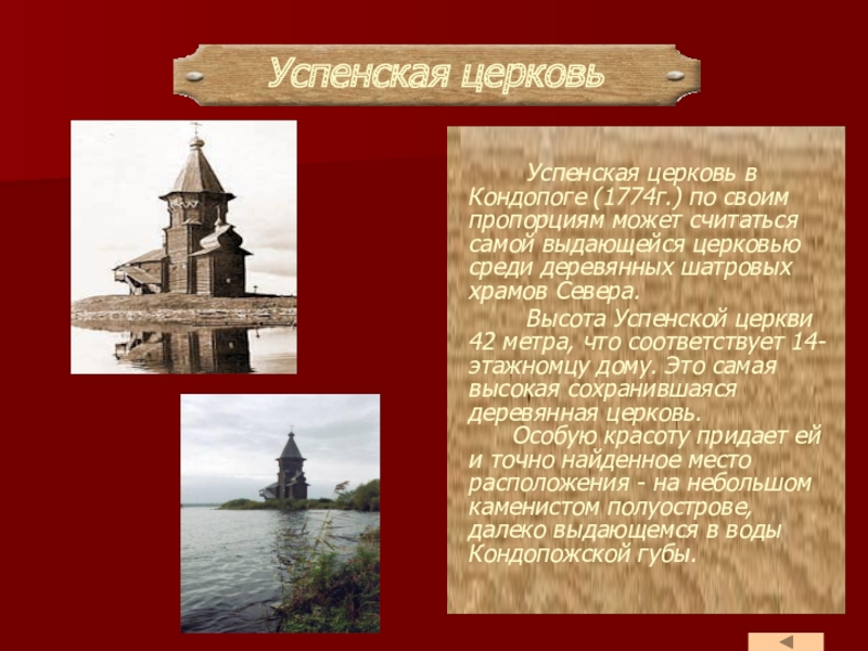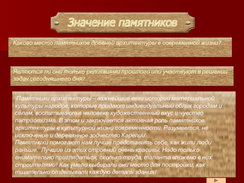 Памятники архитектуры – важнейшие вехи истории материальной культуры народов, которые придают индивидуальный облик городам и сёлам, воспитывают в человеке художественный вкус и чувство патриотизма. В этом и заключается активная роль памятников архитектуры в культурной жизни современности. Разумеется, не исключение и деревянное зодчество Карелии.