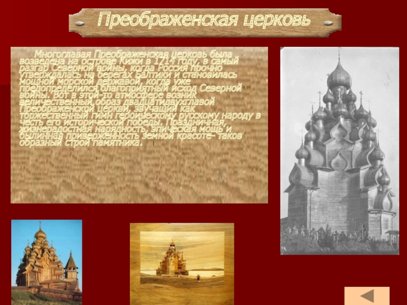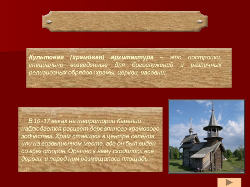 В 16 -17 веках на территории Карелии наблюдается расцвет деревянного храмового зодчества. Храм ставился в центре селения или на возвышенном месте, где он был виден со всех сторон. Обычно к нему сходились все дороги, и перед ним размещалась площадь.
