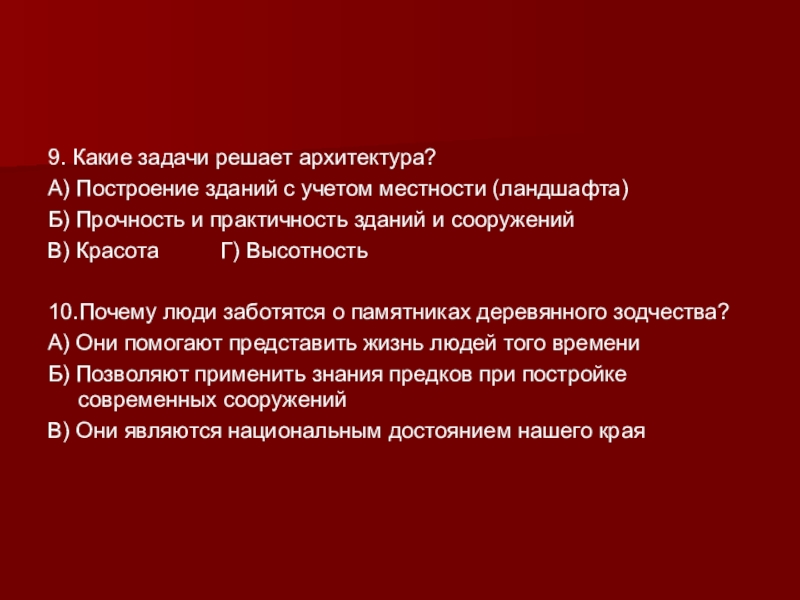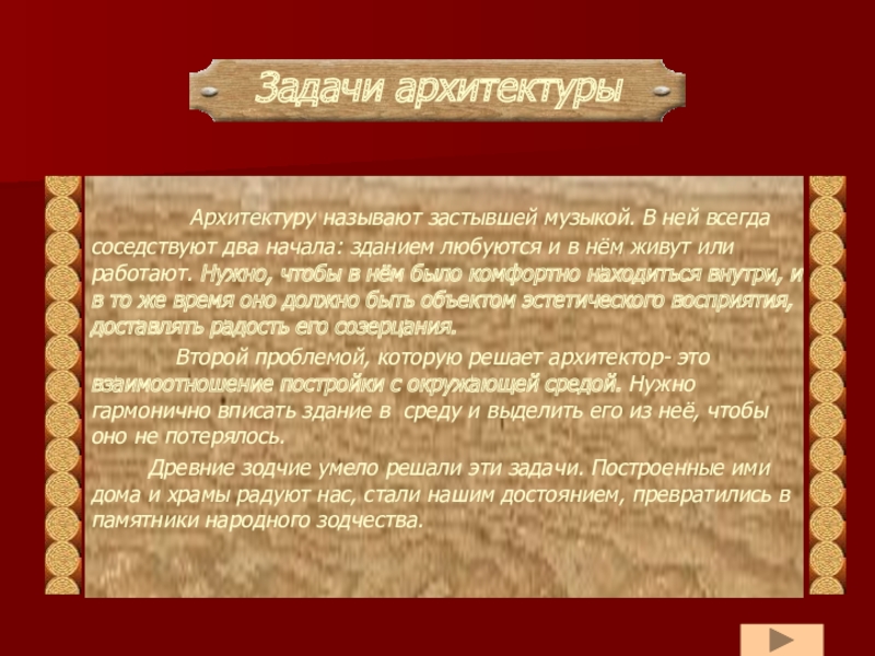 Памятники помогают нам лучше представить себе, как жили люди раньше. Лучшие из этих строений очень красивы. Надо только внимательно приглядеться, сколько труда, таланта вложено в них строителями! Как умело выбирали они место для постройки, как тщательно отделывали каждую деталь здания!
