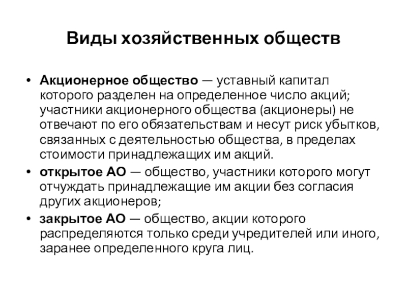 число акций; участники акционерного общества (акционеры) не отвечают по его обязательствам и несут риск убытков, связанных с деятельностью общества, в пределах стоимости принадлежащих им акций.
