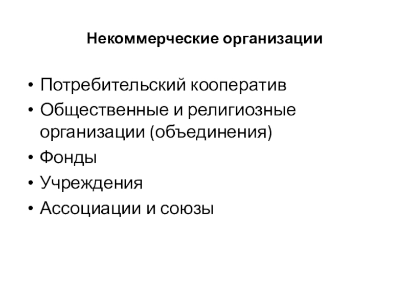Некоммерческими считаются организации, для которых извлечение прибыли не является основной целью и не распределяющие ее среди участников. К их числу относятся потребительские кооперативы, общественные и религиозные организации, некоммерческие партнерства, фонды, учреждения, автономные некоммерческие организации, ассоциации и союзы и др.