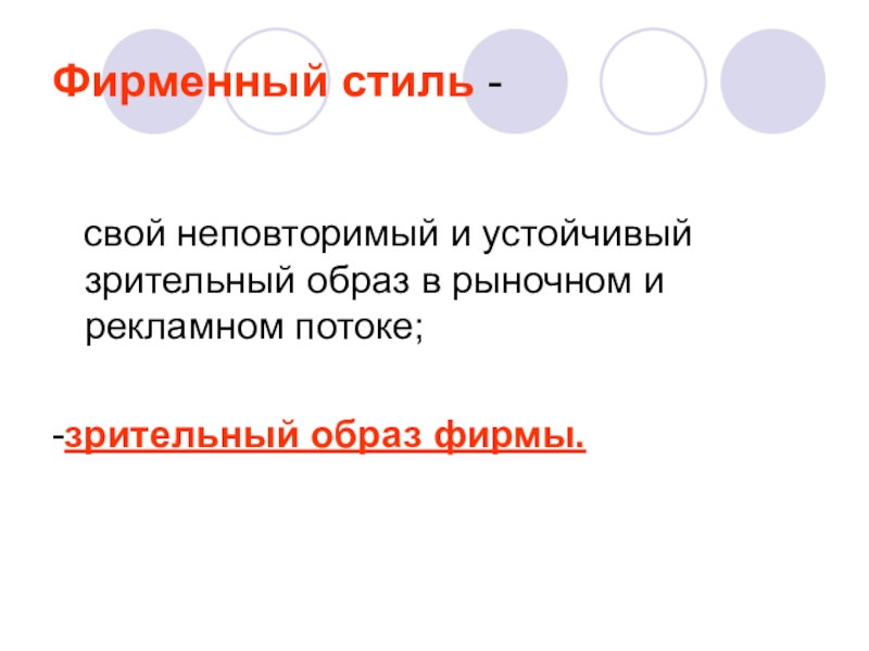 Фирменный стиль -   свой неповторимый и устойчивый зрительный образ в рыночном и рекламном потоке;-зрительный образ