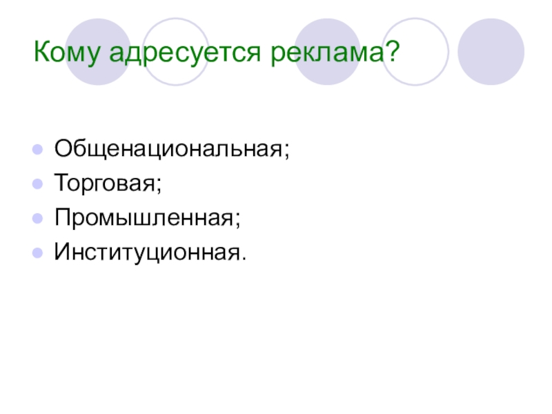 Кому адресуется реклама?Общенациональная;Торговая;Промышленная;Институционная.