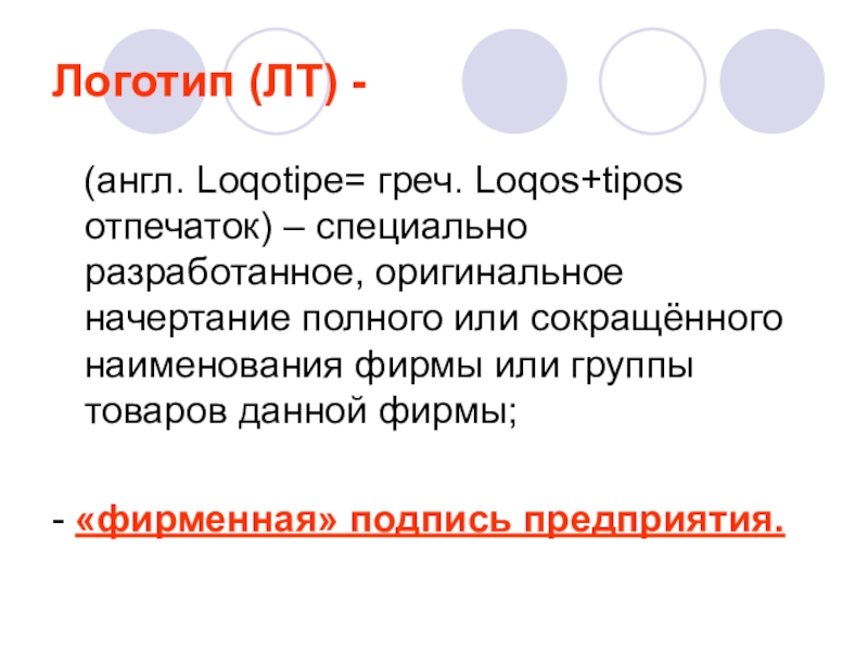 Логотип (ЛТ) -  (англ. Loqotipe= греч. Loqos+tipos отпечаток) – специально разработанное, оригинальное начертание полного или сокращённого