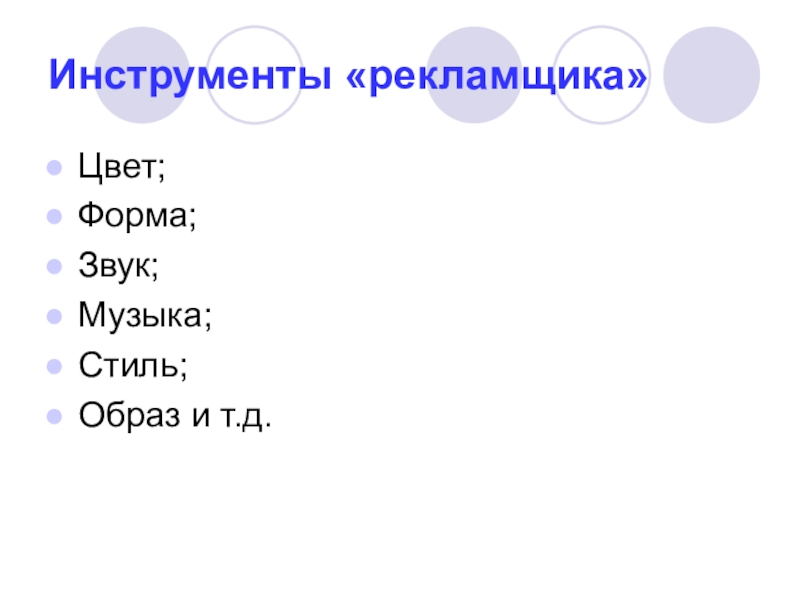 Инструменты «рекламщика»Цвет;Форма;Звук;Музыка;Стиль;Образ и т.д.