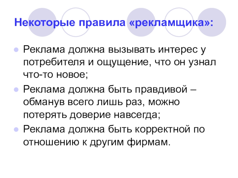 Некоторые правила «рекламщика»:Реклама должна вызывать интерес у потребителя и ощущение, что он узнал что-то новое;Реклама должна быть