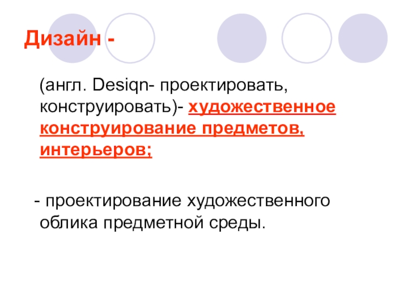 Дизайн -  (англ. Desiqn- проектировать, конструировать)- художественное конструирование предметов, интерьеров; - проектирование художественного облика предметной среды.