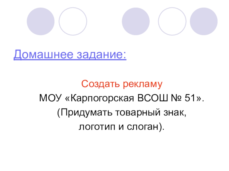 Домашнее задание:Создать рекламу МОУ «Карпогорская ВСОШ № 51».(Придумать товарный знак, логотип и слоган).