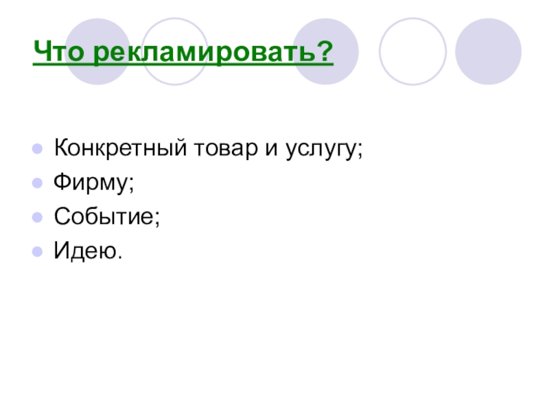 Что рекламировать?Конкретный товар и услугу;Фирму;Событие;Идею.