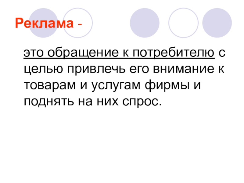 Реклама - это обращение к потребителю с целью привлечь его внимание к товарам и услугам фирмы и поднять на них спрос.