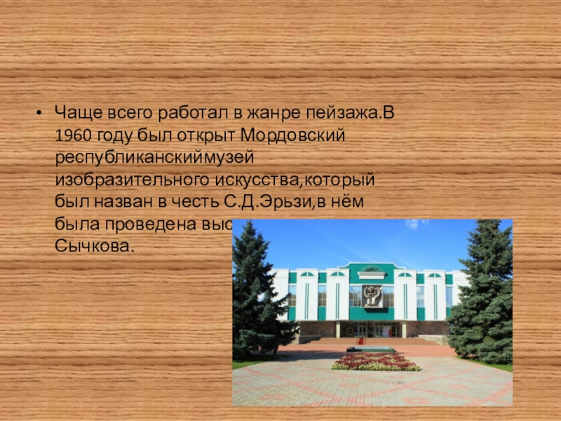 Слайд 7Чаще всего работал в жанре пейзажа.В 1960 году был открыт Мордовский