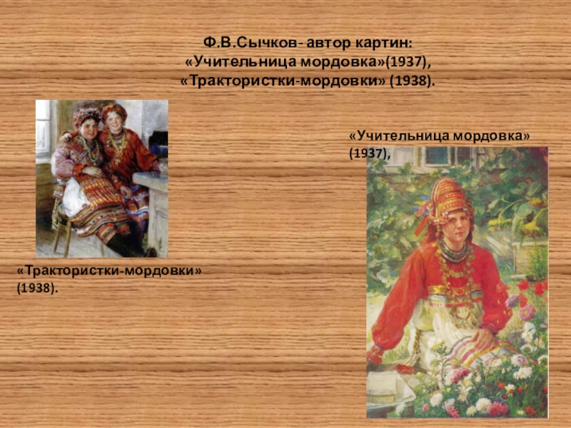 Ф.В.Сычков- автор картин: «Учительница мордовка»(1937), «Трактористки-мордовки» (1938).«Учительница мордовка»(1937), «Трактористки-мордовки» (1938).
