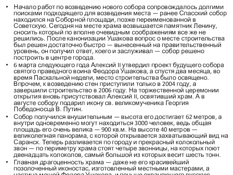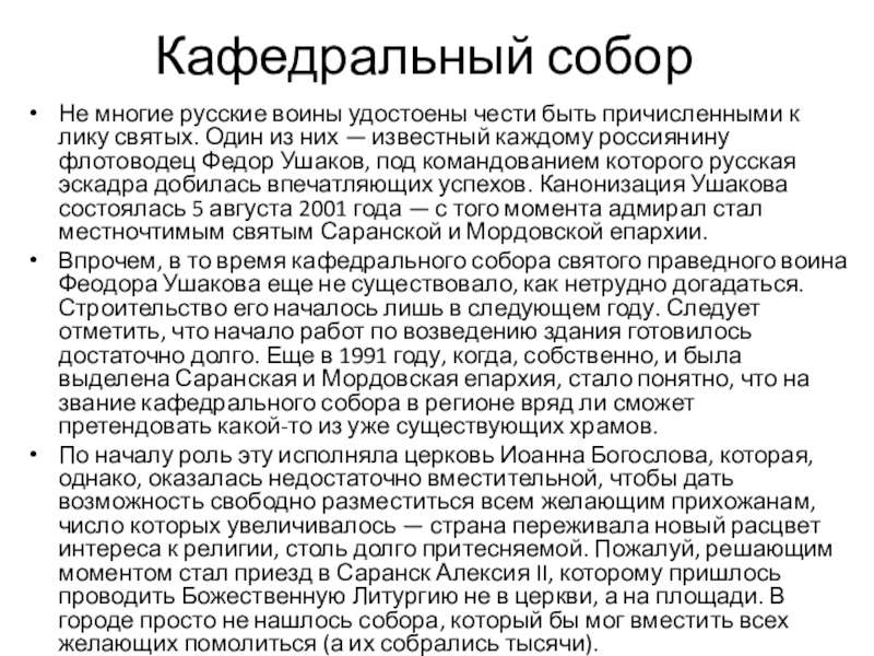 Впрочем, в то время кафедрального собора святого праведного воина Феодора Ушакова еще не существовало, как нетрудно догадаться. Строительство его началось лишь в следующем году. Следует отметить, что начало работ по возведению здания готовилось достаточно долго. Еще в 1991 году, когда, собственно, и была выделена Саранская и Мордовская епархия, стало понятно, что на звание кафедрального собора в регионе вряд ли сможет претендовать какой-то из уже существующих храмов.