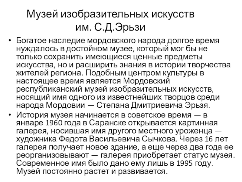 в достойном музее, который мог бы не только сохранить имеющиеся ценные предметы искусства, но и расширить знания в истории творчества жителей региона. Подобным центром культуры в настоящее время является Мордовский республиканский музей изобразительных искусств, носящий имя одного из известнейших творцов среди народа Мордовии — Степана Дмитриевича Эрьзя.
