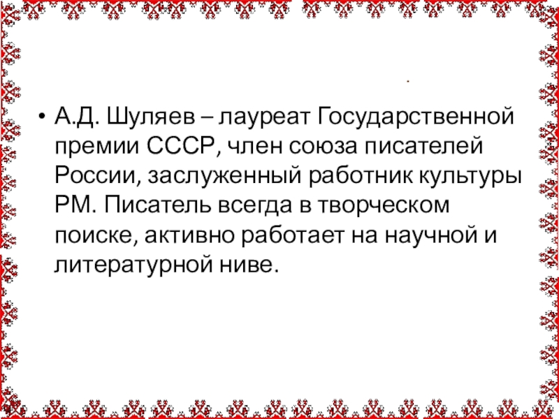 . А.Д. Шуляев – лауреат Государственной премии СССР, член союза писателей России, заслуженный работник культуры РМ. Писатель