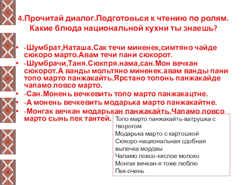 4.Прочитай диалог.Подготовься к чтению по ролям.Какие блюда национальной кухни ты знаешь?-Шумбрат,Наташа.Сак течи миненек,симтяно чайде сюкоро марто.Авам течи