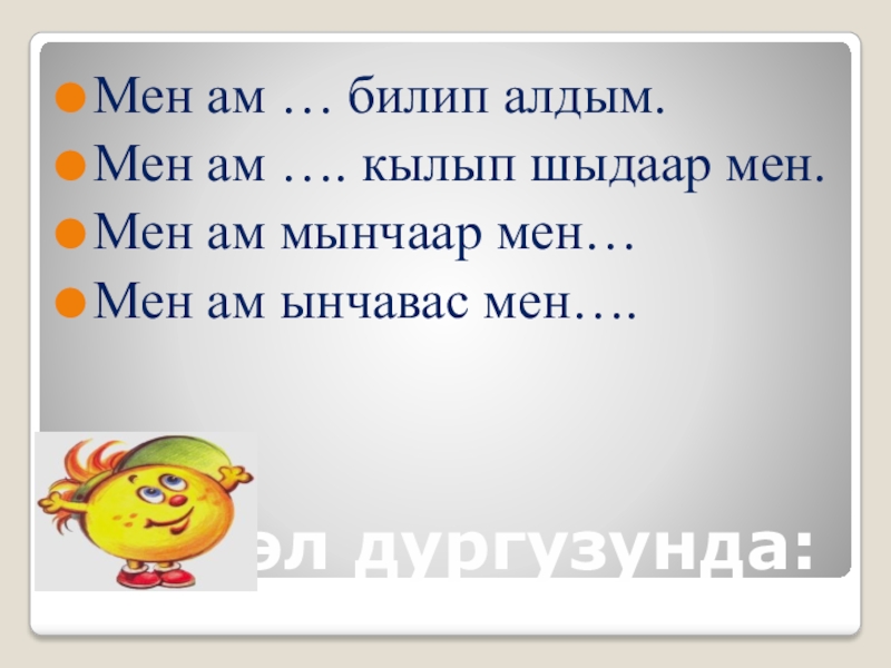 Кичээл дургузунда:Мен ам … билип алдым.Мен ам …. кылып шыдаар мен.Мен ам мынчаар мен…Мен ам ынчавас мен….