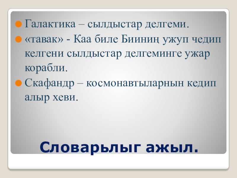 Словарьлыг ажыл.Галактика – сылдыстар делгеми.«тавак» - Каа биле Бииниң ужуп чедип келгени сылдыстар делгеминге ужар корабли.Скафандр –