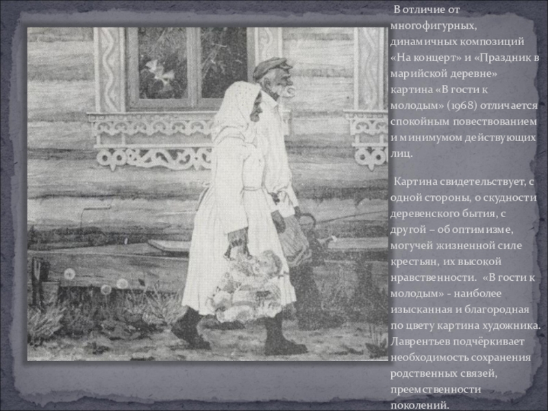 Картина свидетельствует, с одной стороны, о скудности деревенского бытия, с другой – об оптимизме, могучей жизненной силе крестьян, их высокой нравственности. «В гости к молодым» - наиболее изысканная и благородная по цвету картина художника. Лаврентьев подчёркивает необходимость сохранения родственных связей, преемственности поколений.