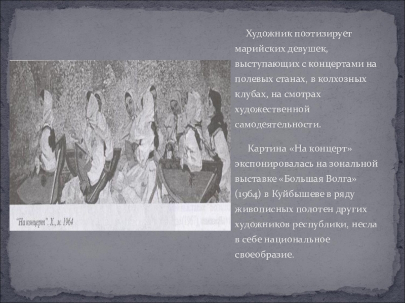 Слайд 8 Художник поэтизирует марийских девушек, выступающих с концертами на