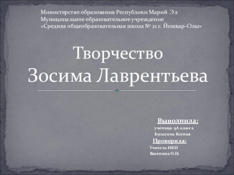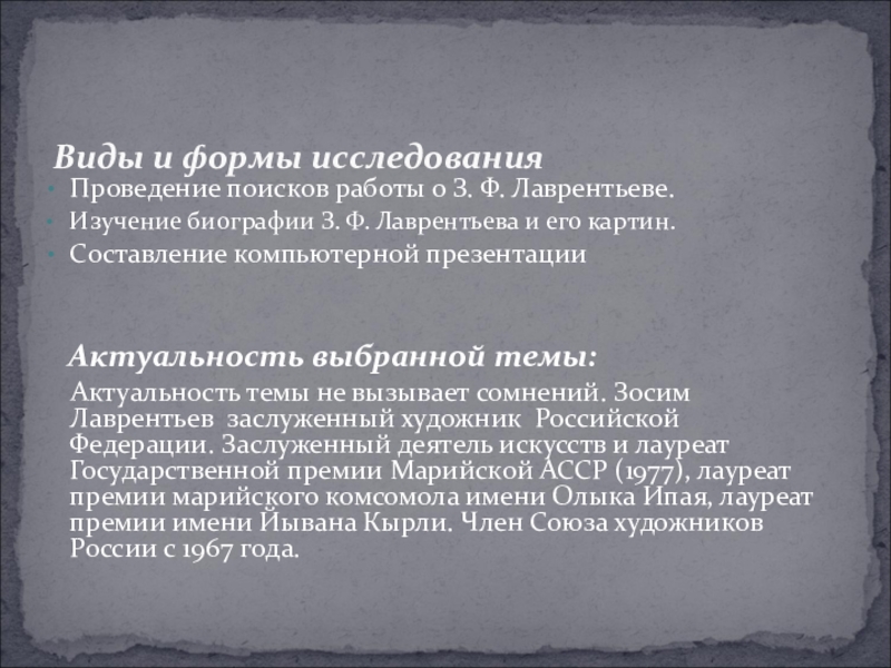 Актуальность темы не вызывает сомнений. Зосим Лаврентьев заслуженный художник Российской Федерации. Заслуженный деятель искусств и лауреат Государственной премии Марийской АССР (1977), лауреат премии марийского комсомола имени Олыка Ипая, лауреат премии имени Йывана Кырли. Член Союза художников России с 1967 года.