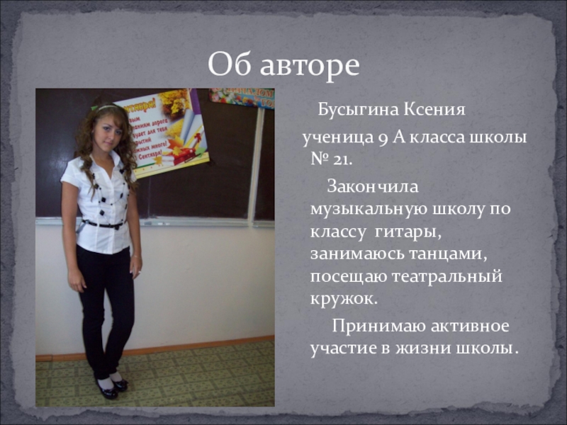 Закончила музыкальную школу по классу гитары, занимаюсь танцами, посещаю театральный кружок.