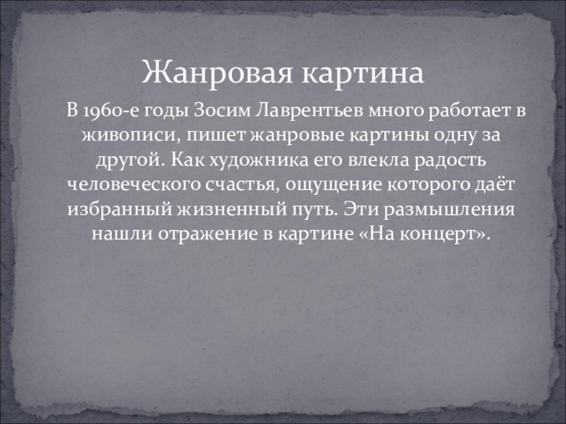 живописи, пишет жанровые картины одну за другой. Как художника его влекла радость человеческого счастья, ощущение которого даёт избранный жизненный путь. Эти размышления нашли отражение в картине «На концерт».