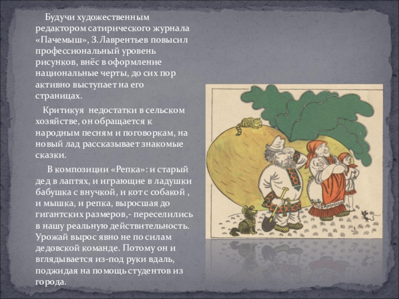 Слайд 18 Будучи художественным редактором сатирического журнала «Пачемыш»,