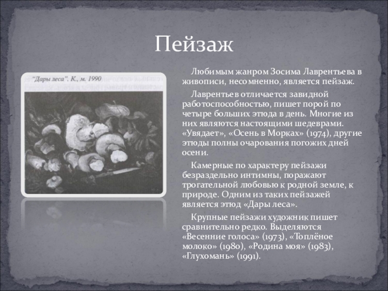 Камерные по характеру пейзажи безраздельно интимны, поражают трогательной любовью к родной земле, к природе. Одним из таких пейзажей является этюд «Дары леса».
