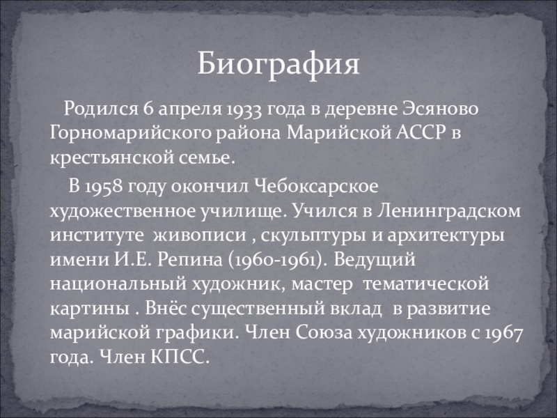 В 1958 году окончил Чебоксарское художественное училище. Учился в Ленинградском институте живописи , скульптуры и архитектуры имени И.Е. Репина (1960-1961). Ведущий национальный художник, мастер тематической картины . Внёс существенный вклад в развитие марийской графики. Член Союза художников с 1967 года. Член КПСС.