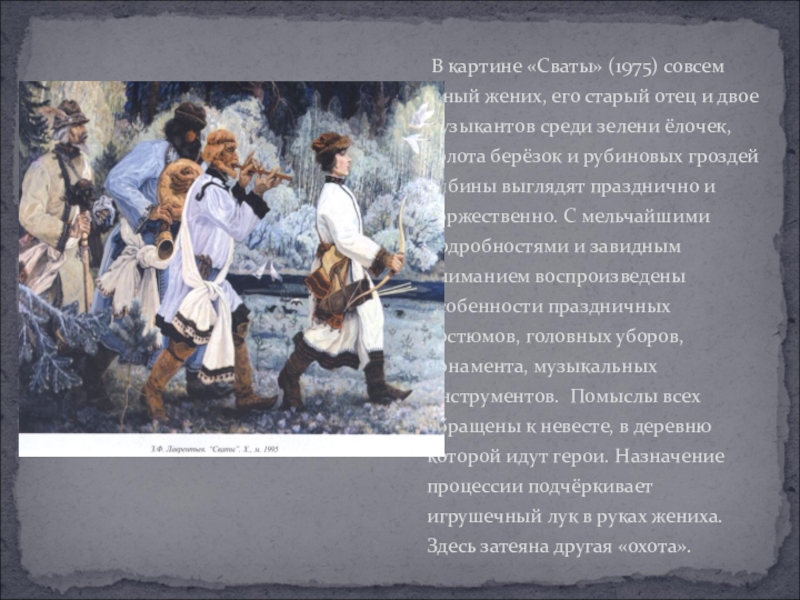 и двое музыкантов среди зелени ёлочек, золота берёзок и рубиновых гроздей рябины выглядят празднично и торжественно. С мельчайшими подробностями и завидным вниманием воспроизведены особенности праздничных костюмов, головных уборов, орнамента, музыкальных инструментов. Помыслы всех обращены к невесте, в деревню которой идут герои. Назначение процессии подчёркивает игрушечный лук в руках жениха. Здесь затеяна другая «охота».