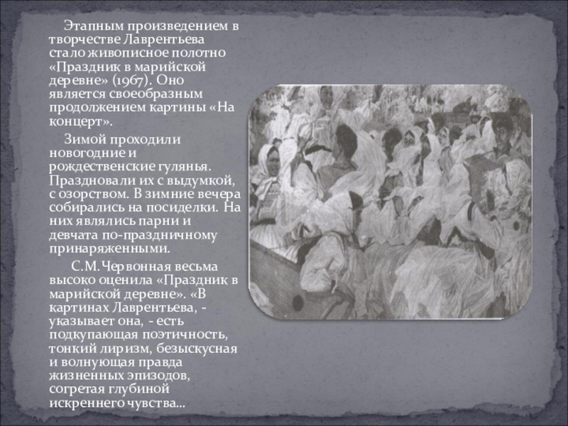 в творчестве Лаврентьева стало живописное полотно «Праздник в марийской деревне» (1967). Оно является своеобразным продолжением картины «На концерт».