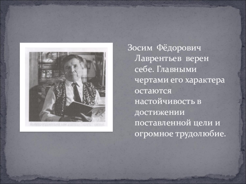 Слайд 20Зосим Фёдорович Лаврентьев верен себе. Главными чертами его характера остаются настойчивость
