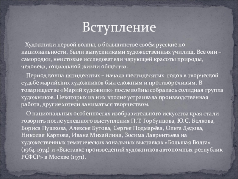 Период конца пятидесятых – начала шестидесятых годов в творческой судьбе марийских художников был сложным и противоречивым. В товариществе «Марий художник» после войны собралась солидная группа художников. Некоторых из них вполне устраивала производственная работа, другие хотели заниматься творчеством.