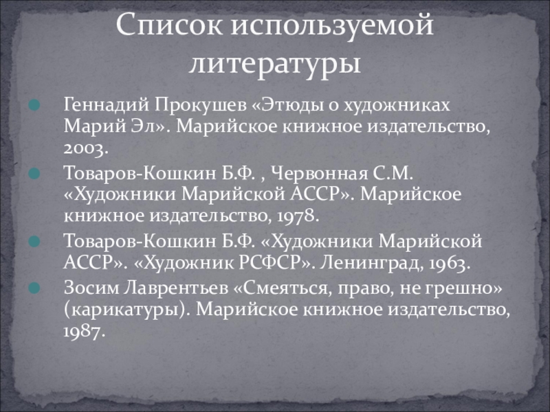 Слайд 21Геннадий Прокушев «Этюды о художниках Марий Эл». Марийское книжное издательство, 2003.
