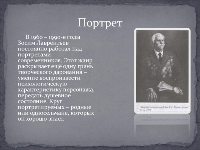 Зосим Лаврентьев постоянно работал над портретами современников. Этот жанр раскрывает ещё одну грань творческого дарования – умение воспроизвести психологическую характеристику персонажа, передать душевное состояние. Круг портретируемых – родные или односельчане, которых он хорошо знает.